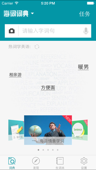 海词是中国第一个互联网词典,拥有上亿用户,以词典种类最全、词量最大、讲解最细为特色,涵盖46个行业,10个语种,2千万词汇,不但有词源、用法、辨析、例句、词组等精细讲解,还有四六级、初高中、考研、托福雅思等考试分类讲解。除此之外,还有背单词、翻译、每日学习阅读等辅助功能。