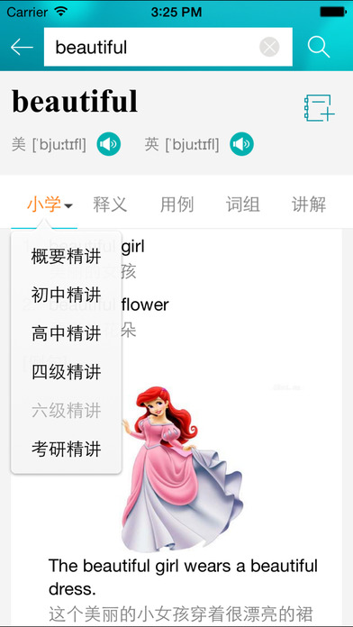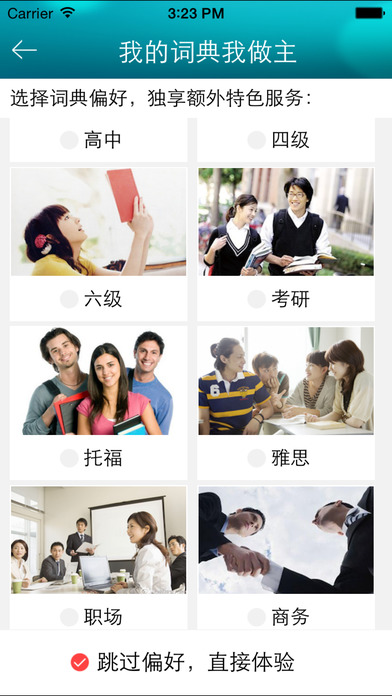 2、个性化词典:根据学习目标,可个性设置为“职场、商务、托福、雅思、考研、四级、六级、初高中、儿童”等词典偏好,获取独家的特色服务功能。