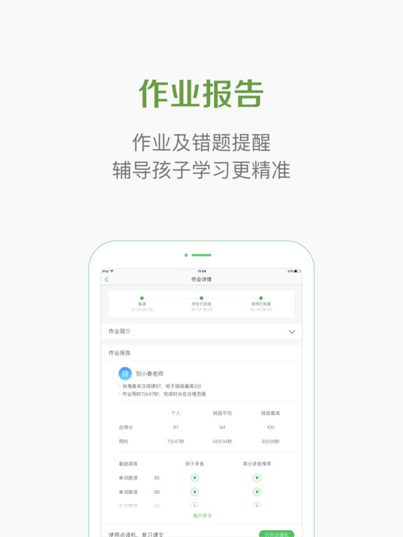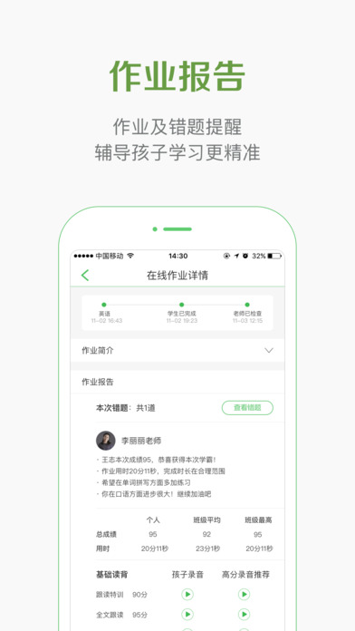作业报告:帮您随时掌握孩子的作业成绩,动动手指,就能把孩子的作业内容、完成情况、知识点掌握情况全知晓,轻松参与孩子的学习成长过程;