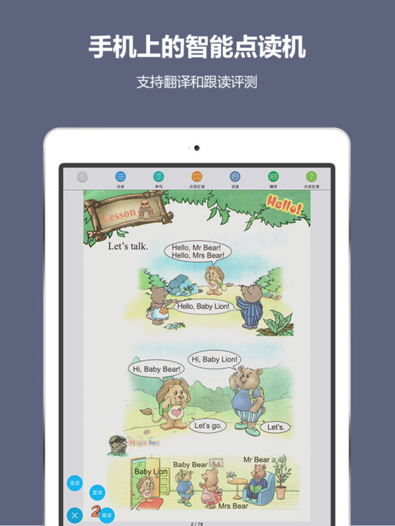 【特色1】手机变身点读机:全国小学课本全覆盖,小学语文、英语课本在线(支持离线下载)点读,同时还有专业英语翻译和跟读评测!