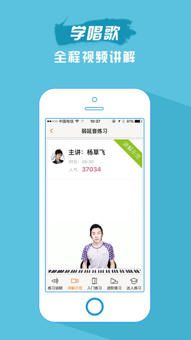 『唱功分享』流行歌坛经典现场一网打尽!流行唱法免费教程应有尽有!海量免费高清流行音乐教学视频为您系统普及讲解流行唱法声乐知识、乐理知识、同时也包括钢琴弹唱、吉他弹唱、视唱练耳、五线谱、简谱、节奏、作曲、乐器等小知识教学,让你随时随地体验明星音乐在线课堂的魅力,K歌达人必备。