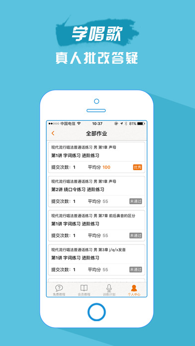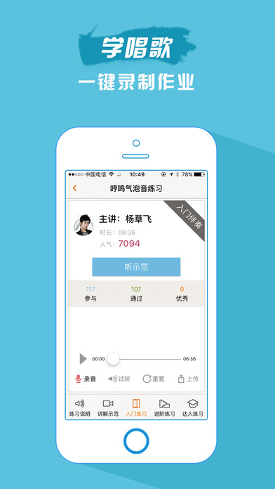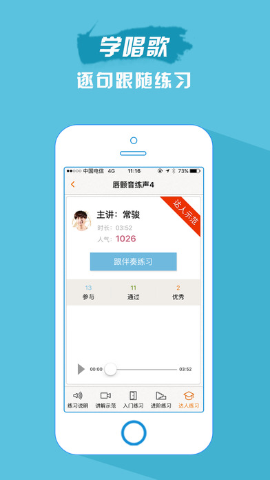 『会员教程』非凡的学唱歌体验,拥有实力派流行歌手的唱功就是如此的简单。海量流行声乐练习曲,每条练习都分为讲解示范、入门练习、进阶练习、达人练习,每条练声伴奏均经过精心编曲制作并由专业流行唱法大师完美示范。您可以跟着专业示范进行练习、逐句跟唱,也可以录音上传由老师批改评分,就如同在音乐学院教室由专业的声乐老师陪你练习一样,想要参加中国好声音、快乐女声、加油美少女、燃烧吧少年、天娱练习生的音乐爱好者必练。