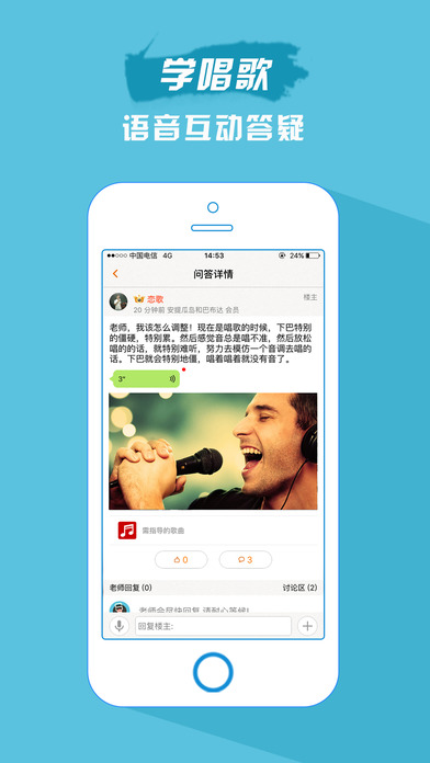 『演唱问答』演唱问答模块,您可以用文字、语音等方式向老师提问,也可以发布自己演唱的歌曲求老师点评指导。专业的流行唱法声乐导师会用文字或语音为您耐心讲解,会推荐适合您的练习或训练计划供您练习。支持添加唱吧、全民K歌、酷我K歌、天籁K歌、演唱汇、好唱、VV音乐、欢唱、咪咕爱唱、酷狗音乐、K歌达人、爱唱、于斯课堂等手机KTV音乐软件录制的歌曲录音,不仅仅是为唱歌评分打分,更重要的是助您迅速提高演唱水平,比直接分享到微信、QQ、微博、豆瓣、知乎等社交平台更有价值。