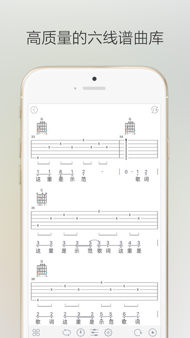 "爱玩吉他"也同时提供曲谱的六线谱视奏模式,并能显示歌词以及简谱,还能根据自己喜好,自由切换横竖屏展现方式,真实还原了纸质曲谱的形式,再也不需要买书或者下载打印了,让读谱、识谱变得更轻松简单。