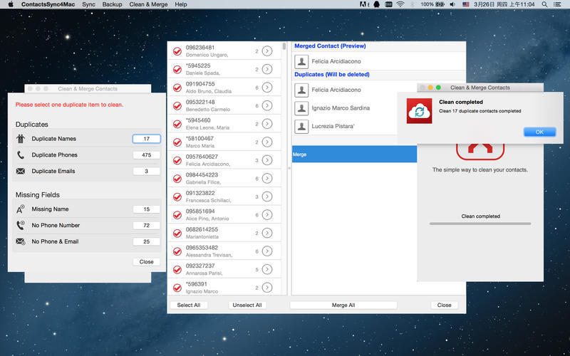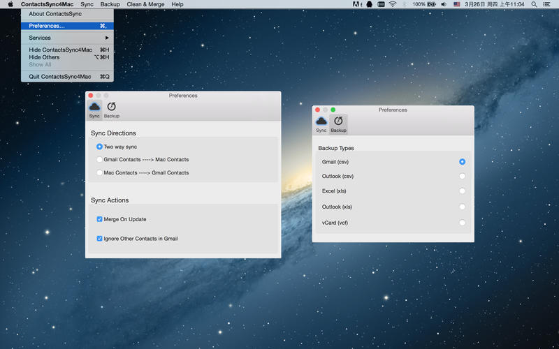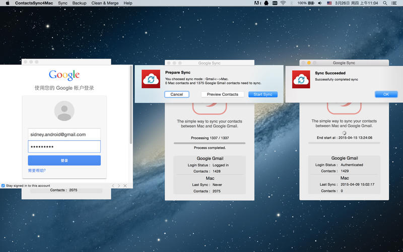 Google联系人同步,备份清理助手允许您快速、方便的同步Gmail和Mac联系人信息。利用此工具,您可以很容易的在多个手机平台与Mac设备以及PC机之间同步您的联系人。应用支持Mac OSX 10.7+系统。