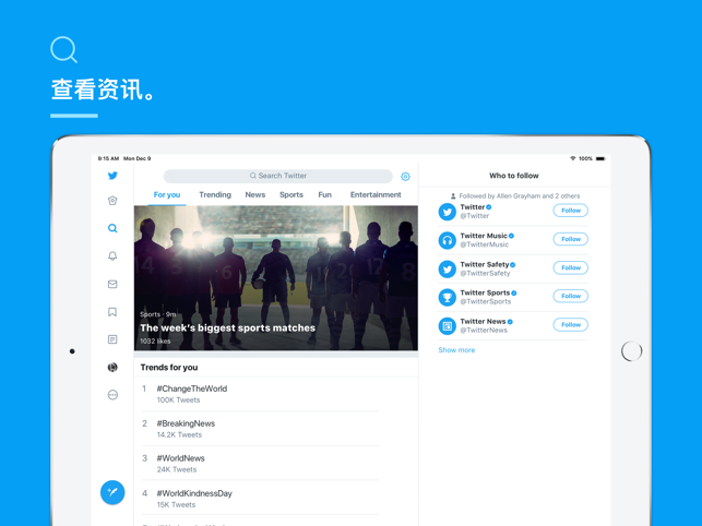 私聊或群聊,还可与您的关注者发起群组对话。在好友或其他Twitter关注者的社交媒体帖子下发表评论。和成百上千有趣的Twitter用户一起关注您喜爱的名人新闻,一目了然地浏览相关内容。用热门故事、现场新闻、笑话、动图、照片和视频,活跃您的社交网络。分享国内新闻或直播,发现您的哪些推文被点赞或转推。