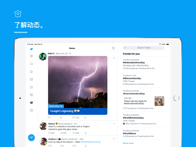 iPad版客户端你可以和你的关注着分享各种实时信息、照片、动态,还可以简短的互相对话。Twitter(推特)可以说是微博的创始者,自Twitter之后才有了微博这个名词,Twitter是目前信息交流量最大的网站之一,目前全世界访问量前十的网站。