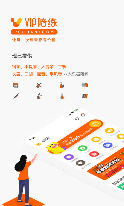VIP陪练为孩子提供专业的在线1对1乐器陪练,包含钢琴、小提琴、古筝和手风琴四种类别。领取50分钟免费体验课