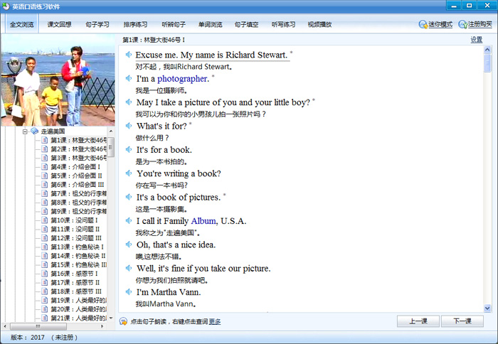 2、软件支持全文浏览、课文回想、句子学习、排序练习、听辨句子、单词浏览、句子填空、听写练习、视频播放功能,可以帮助用户全方面学习英语口语