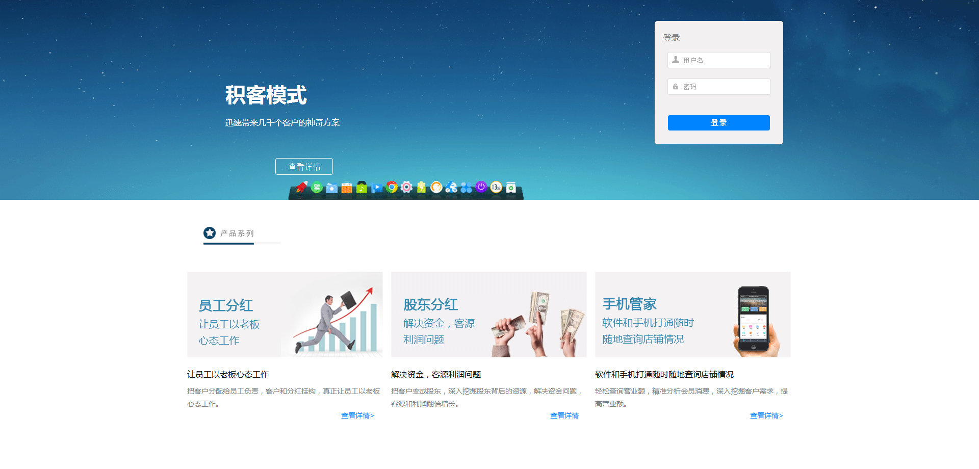 按照功能模块主要分为11个模块。管理软件,微信营销,吸粉wifi ,积客模式,股东分红,员工分红,客户转介绍,手机管家,微信支付,手机开单,平板开单。