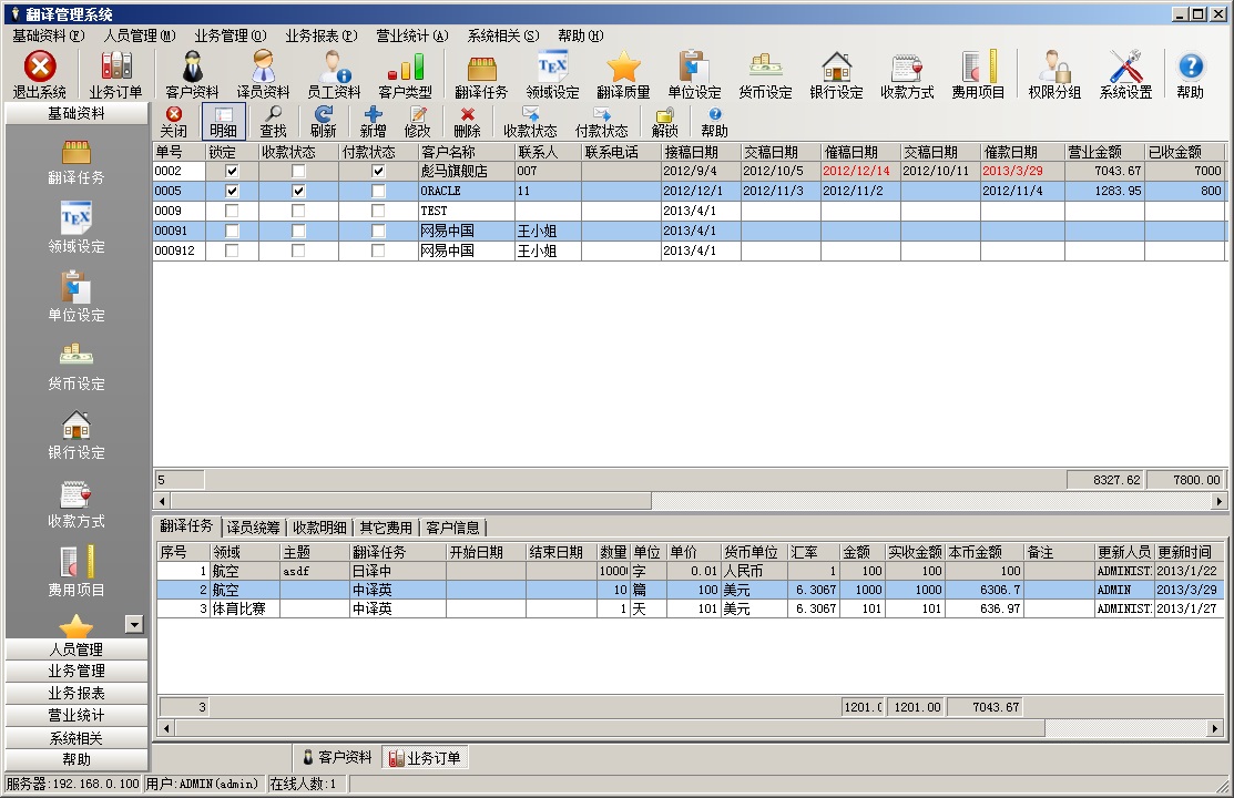 4、翻译订单管理:订单信息维护,可选择当前订单的业务提成,选择接单跟单人员。一个订单可以有多个翻译项目。每个翻译项目可以有一个或者多个翻译人员进行翻译。收款状态,支出状态管理:用于对客户的应收款和对译员的应付款进行管理。在此处对客户的每次付款进行管理,哪天,付哪种款项(全款、余款)等。翻译工作完成后,在收到所有款项后,对译员工资进行发放,对每个译员定一个支付日期,在报表中可以查到当前月对哪些译员应付多少款项等情况一目了然,减少手工计算带来的人为出错和繁琐工作,提高公司运作效率。