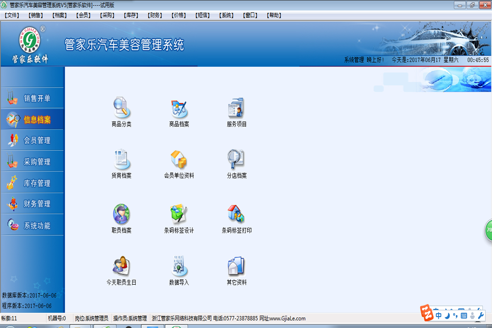 用于初始化、管理及维护软件的基本资料信息。主要包含有:商品分类、商品项目、服务项目、货商档案、会员单位资料、分店档案、其它资料以及数据导入等功能模块