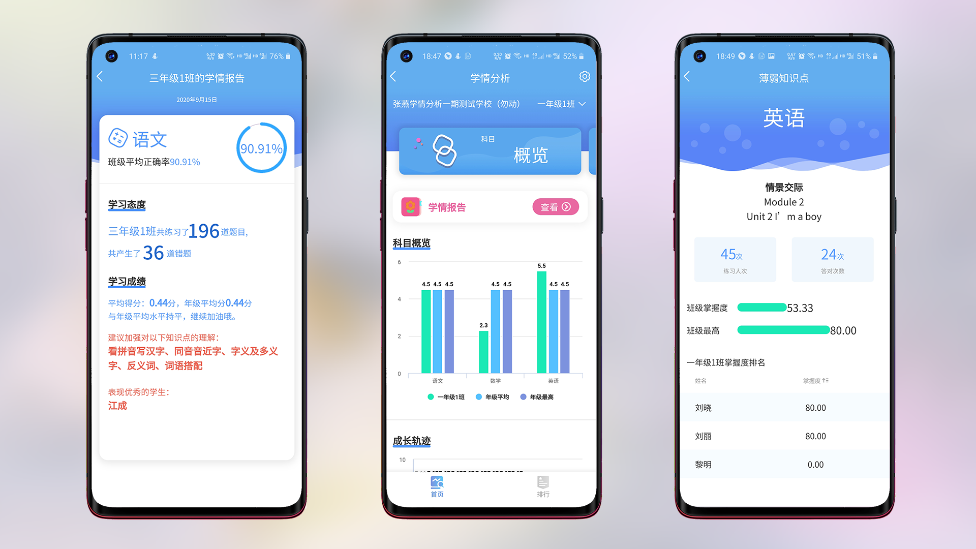 学情分析:全面分析孩子各科目、各方面学习成果,提供最贴合的数据分析,帮助孩子、家长及老师进一步掌握孩子学习情况,从而进行更好的教学、学习。